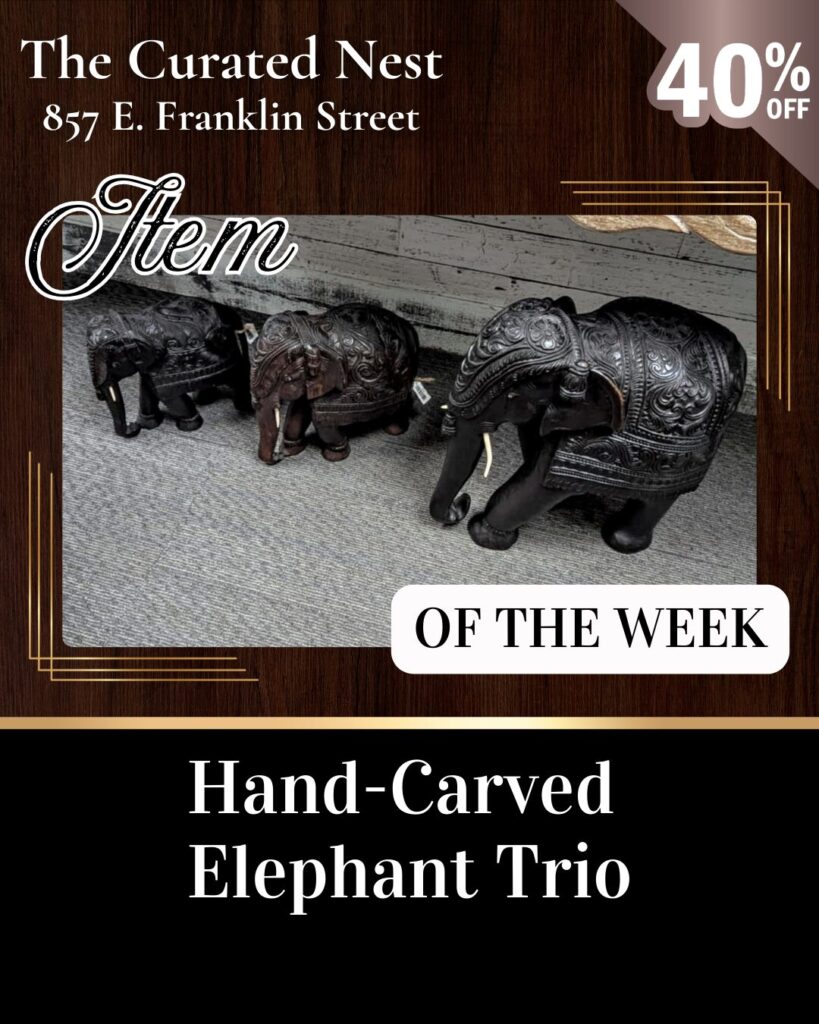 The deep black hue of the wood is beautifully contrasted by small, light-colored tusks, providing an authentic accent. The trio features three perfectly graduated sizes – small, medium, and large – which create a dynamic visual display, suggesting a family or parade. Due to the substantial size of the largest elephant and the density of the dark wood, this set makes a bold impact, commanding attention wherever they are placed. As genuinely hand-carved pieces, they are heirloom-quality collectibles, ideal for buyers seeking global-inspired decor, statement pieces, or objects with rich, intricate detailing.
